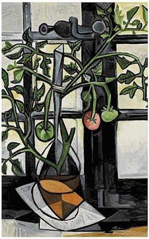 1944年夏天,畢加索與情人瑪麗·特雷斯生活在還處于納粹占領(lǐng)中的法國巴黎,有一天,他為家中窗臺上的番茄植物畫了一幅靜物,既反映了當(dāng)時食物緊缺、人們不得不自己種植農(nóng)產(chǎn)品的現(xiàn)實,同時還以富有生機的色彩和成熟果實的意向表達(dá)了人們強烈的意志力。那個時候,番茄是這座城市窗臺和陽臺上最常見的東西。