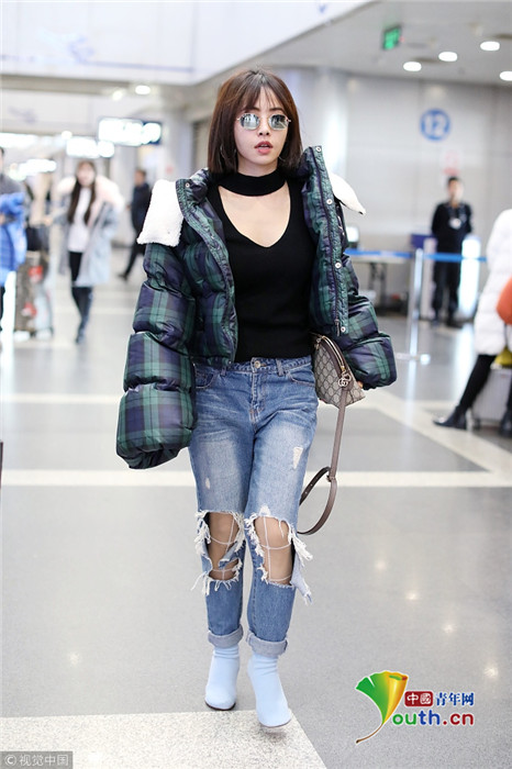 2017年12月8日,北京,蔡依林現(xiàn)身機場,她身穿夸張的格子羽絨服,袖子能藏雷成功擁有“麒麟臂” ,不知是不是在cos鐵臂阿童木。她身穿深V內搭秀胸前春光,氣場全開似走秀,牛仔褲里似乎套著透明“秋褲”,凹造型不忘保暖!