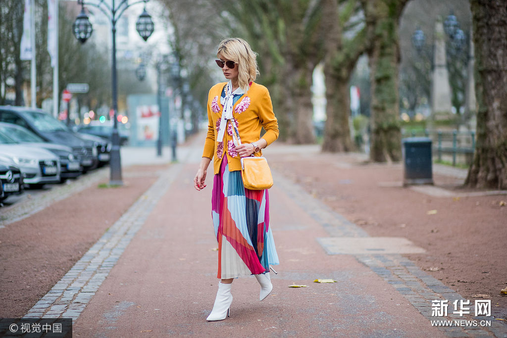 ??? 近日,德國杜塞爾多夫,時尚博主Gitta Banko街拍。她戴Miu Miu茶色墨鏡,身穿Steffen Schraut橘色亮片拼貼針織開衫,內(nèi)搭Steffen Schraut白色蝴蝶印花系帶雪紡襯衫,Steffen Schraut拼色百褶紗裙,肩背Volker Lang橘色口金包,腳踩Kurt Geiger白色尖頭高跟短靴。