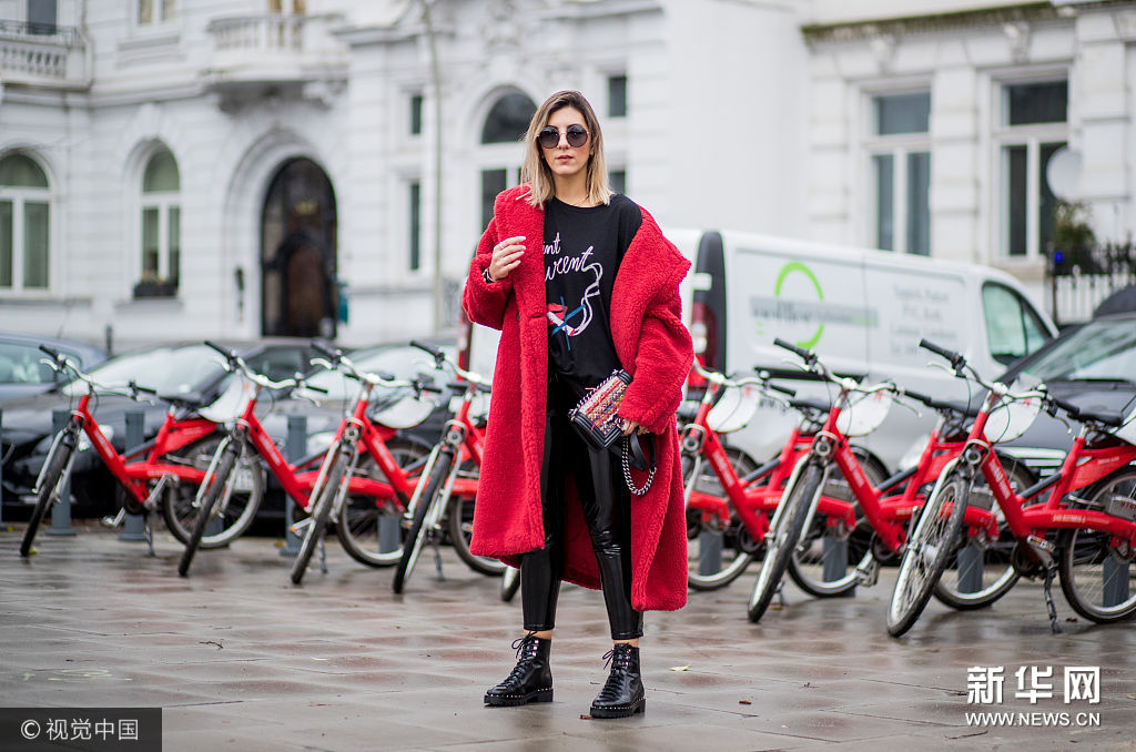 ??? 當(dāng)?shù)貢r(shí)間2017年12月5日,德國(guó)漢堡,時(shí)尚博主Aylin Koenig街拍。她戴Dolce & Gabbana黑色圓框墨鏡,身穿Max Mara紅色羊羔毛大衣,內(nèi)搭Saint Laurent黑色字母紅唇印花衛(wèi)衣,手拎Chanel粗呢拼接鏈條包,下穿Asos黑色漆皮緊身皮褲,腳踩Valentino黑色金屬釘鑲嵌系帶短靴。