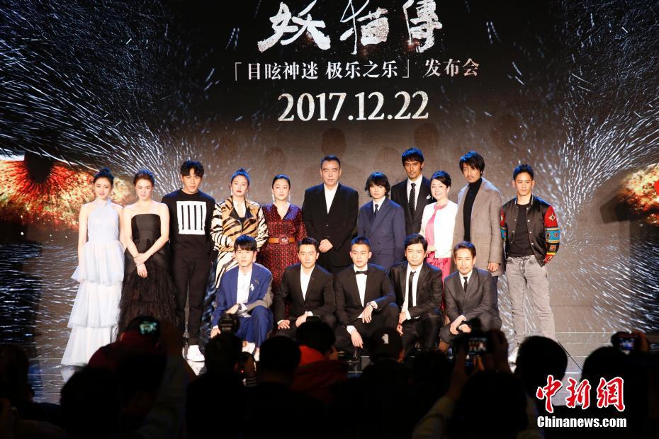 12月17日,由陳凱歌導(dǎo)演的賀歲奇幻題材電影《妖貓傳》在北京舉行全球首映發(fā)布會(huì),導(dǎo)演陳凱歌,制片人陳紅攜主演黃軒、染谷將太、張雨綺、秦昊、張榕容、張魯一、劉昊然、阿部寬、松坂慶子等亮相。影片改編自日本作家夢枕貘的魔幻系列小說《沙門空?!?,將于22日起在中國內(nèi)地上映。圖為眾主創(chuàng)合影。中新社記者 李慧思 攝