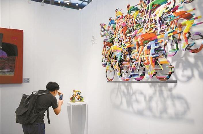 參展商“譽(yù)美國際”的展臺(tái)外墻上,一場疾馳中的跑馬比賽正酣。將不銹鋼板切片組合,飾以熱情而愉悅的色彩,這兩組風(fēng)格極具個(gè)性化的墻面雕塑作品,均來自以色列國寶級藝術(shù)家大衛(wèi)·格斯坦,引得不少觀眾駐足欣賞。