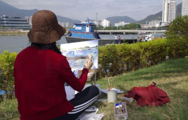 優(yōu)美的景色映入畫家們眼簾,點燃了他們的創(chuàng)作激情。來到鹽田之后,藝術家們紛紛找好寫生地點,擺好畫架,迅速進入創(chuàng)作的狀態(tài)。他們當中一部分來到了鹽田漁港,鹽田海鮮街后的小漁村避風港。蔚藍的大海、旁邊的綠樹、避風塘內(nèi)停泊的船只、白色的海鳥、釣魚的人以及遠方火熱的建設場景都呈現(xiàn)在畫家的筆端;另一部分藝術家來到了位于三洲田深圳會計進修學院的梧桐溪谷,小橋流水人家、奇石山林則一一被傾注于畫紙。