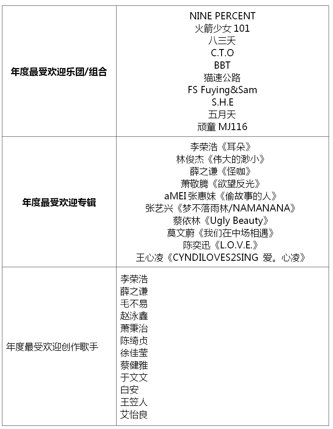 “年度最受歡迎樂隊/組合”入圍名單中,同在2018年成功舉辦巡回演唱會的五月天、S.H.E等老牌組合的進(jìn)榜,讓大家看到了華語樂壇常青樹的非凡音樂實力;八三夭、C.T.O、BBT、FS Fuying&Sam、頑童MJ116等組合,憑借不減反升的人氣魅力實力進(jìn)榜;而NINE PERCENT、火箭少女101及貓速公路等新人組合的二次入圍,不僅僅是對他們在音樂成績上的肯定,更是對其未來之路的鼓勵。