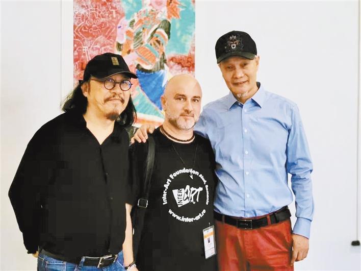 樊鴻賓(右)、鄒明(左)在畫(huà)展上與當(dāng)?shù)厮囆g(shù)家合影。(主辦方供圖)