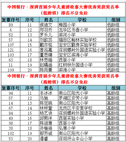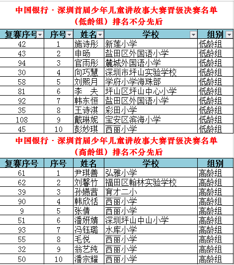 從全市近百所學(xué)校、社會(huì)賽區(qū)報(bào)名的萬余名參賽選手中脫穎而出的選手們齊聚復(fù)賽賽場,比賽競爭異常激烈。晉級(jí)復(fù)賽的225人(其中高齡組104人,低齡組121人)使出渾身解數(shù),講述著自己喜歡的故事,最終高、低齡組每組各10人晉級(jí)決賽,低齡組新蓮小學(xué)施詩彤、鹽田區(qū)外國語小學(xué)申旸等10位選手,高齡組弘雅小學(xué)尹琪善、福田區(qū)翰林實(shí)驗(yàn)學(xué)校劉馨竹等10位選手“殺出重圍”,奪得決賽名額。