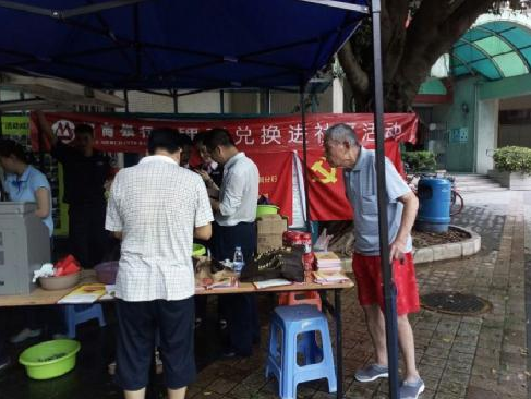 社區(qū)工作人員向居民介紹便民服務(wù)活動