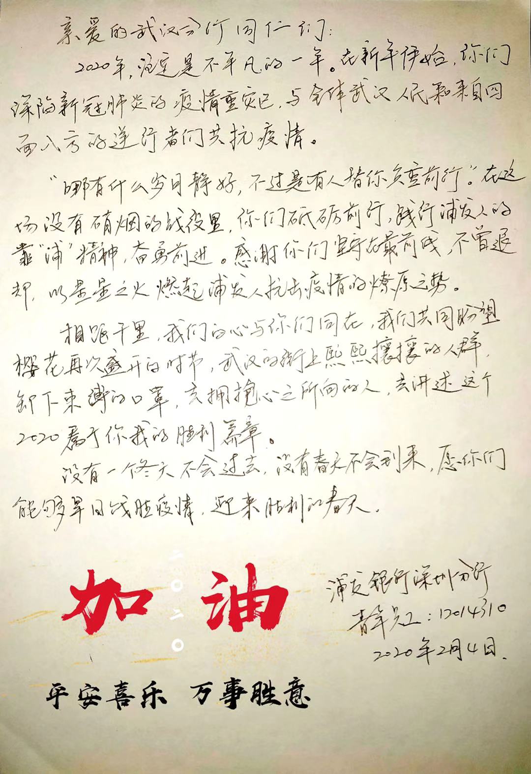 2月3日,浦發(fā)銀行深圳分行團委向全體青年員工發(fā)出了一封倡議書。在倡議書中,該行團委號召廣大團干部、團員青年立即行動,充分發(fā)揮黨的助手和后備軍作用,展現(xiàn)青年突擊隊作為,為堅決打贏疫情防控阻擊戰(zhàn)貢獻力量,并向青年提出三個要求:“堅定信心不迷茫,聽黨指揮勇?lián)敗薄ⅰ翱茖W(xué)防范不信謠,眾志成城控疫情”、“居家辦公不離崗,服從指揮勇?lián)敗?。當日,浦發(fā)銀行深圳分行發(fā)起了給武漢分行同事寄送家書的活動,該行全體青年手寫家書,圖文并茂、紙短情長,表達了對疫區(qū)“戰(zhàn)友們”最深切的關(guān)愛和鼓勵,身體力行做好他們堅強的后盾。