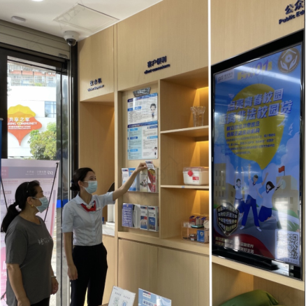 在網(wǎng)點營業(yè)大廳內(nèi),電子屏中的2021年金融知識普及月海報營造了良好宣傳氛圍。金融之手,強而有力,各營業(yè)網(wǎng)點一手承接了金融知識普及多方面的內(nèi)容,共同構(gòu)建了線上線下、電信、網(wǎng)絡等多渠道傳播的金融知識普及傳播網(wǎng),有力推進,勢在必行。
