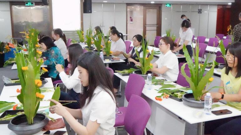 活動(dòng)現(xiàn)場,馮老師詳細(xì)介紹了傳統(tǒng)花藝的歷史文化、插花造型、色彩搭配、器具應(yīng)用等基礎(chǔ)知識,從花語寓意、花材修剪、構(gòu)圖等方面深入淺出的講解插花的要點(diǎn)。在悠然的花香浸染間,輕柔的音樂熏陶中,大家按照馮老師展示的步驟,將花朵、樹葉精心剪裁、混搭、點(diǎn)綴成束,將一朵一朵鮮花、綠葉錯(cuò)落有致地插在花盆中里,普通的花葉、枝條,經(jīng)過大家精巧的修飾與加工之后,變成了令人賞心悅目的藝術(shù)品。整個(gè)會(huì)場花香四溢,歡聲笑語,充滿了輕松歡快的氛圍。