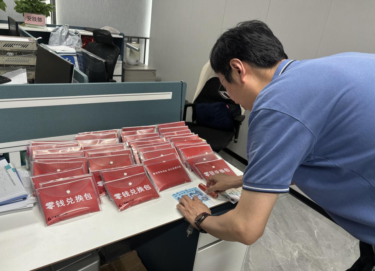 “經(jīng)常碰到老年人或者外國人打車時給我一百元的大鈔,可我沒有零錢找啊,需要開到路邊等客戶去便利店或商鋪換零錢?,F(xiàn)在廣發(fā)銀行上門來給我換零錢,幫我解決了大問題,可以節(jié)約時間多接幾個單,多賺點錢嘍!”出租車司機李師傅興奮地說道。僅一分鐘,他便兌換好了一個200元的零錢包。