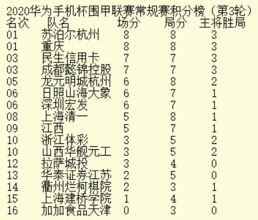 2020華為手機(jī)杯中國圍棋甲級聯(lián)賽第三輪深圳宏發(fā)3:1浙江體彩。具體戰(zhàn)況如下: