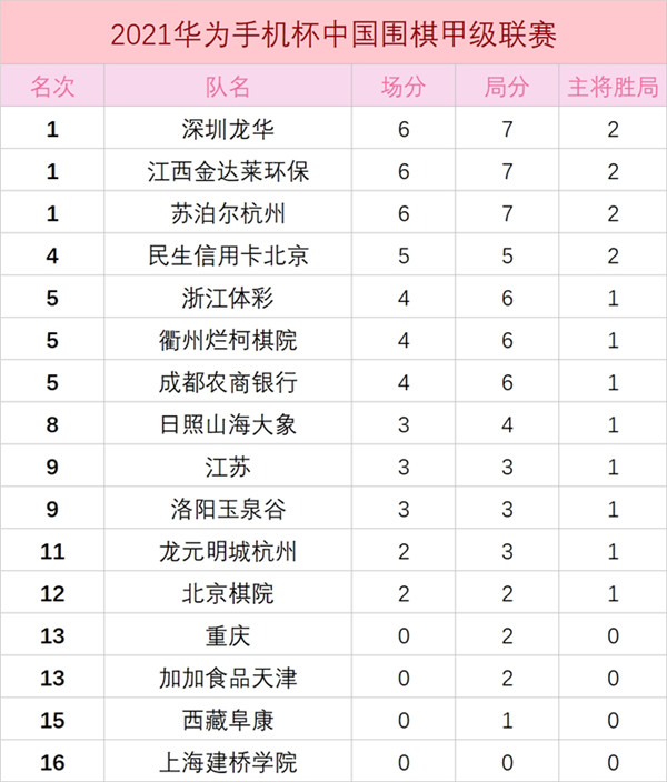第二輪參賽各隊(duì)?wèi)?zhàn)況今天出現(xiàn)令人“驚奇”的一幕:四個(gè)4:0,兩個(gè)3:1。具體比分如下:北京棋院隊(duì)0:4浙江體彩隊(duì);江西金達(dá)萊環(huán)保4:0西藏阜康隊(duì);上海建橋?qū)W院隊(duì)0:4蘇泊爾杭州;洛陽隊(duì)0:4衢州隊(duì);加加食品天津隊(duì)1:3江蘇隊(duì);龍?jiān)鞒呛贾?:2主將勝日照山東大象隊(duì);北京隊(duì)2:2成都隊(duì);洛陽。截止目前,江西、蘇泊爾杭州、深圳龍華三隊(duì)積6分列第一,上海隊(duì)因0:4連輸兩場墊底。
