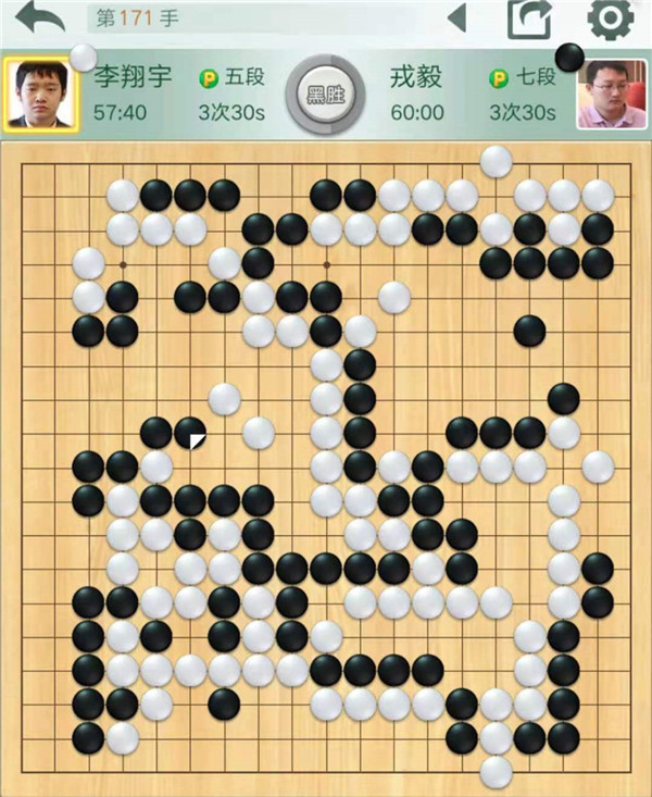 今日比賽中,三臺快棋戎毅執(zhí)黑對陣小將李翔宇,黑棋下方作戰(zhàn)失利早早進(jìn)入敗勢。后來白棋中央突然將自己大龍走死,黑棋幸運(yùn)獲勝,行棋171手。