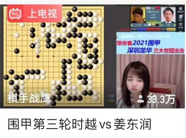 今日虎牙直播對(duì)深圳龍華隊(duì)的現(xiàn)場(chǎng)講解點(diǎn)評(píng)沖上了33.3萬(wàn)人次的大關(guān),人氣可謂一路上升!職業(yè)女棋手戰(zhàn)鷹解說(shuō)生動(dòng)有趣,棋迷們聽(tīng)得也過(guò)癮。再有“龍哥”“申一冠”的迷粉,直播室熱鬧非凡!戰(zhàn)鷹是圍棋知名主播,作為深圳龍華隊(duì)網(wǎng)上直播合作人,為龍華隊(duì)的宣傳還真是帶來(lái)不小的效應(yīng)!明天繼續(xù)吧。