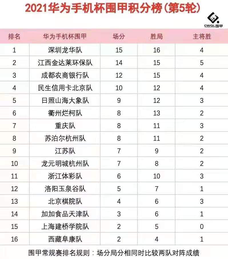 第五輪各隊(duì)?wèi)?zhàn)況如下:衢州爛柯4比0勝加加食品天津;浙江體彩隊(duì)1:3深圳龍華隊(duì);日照山海大象隊(duì)1:3江西金達(dá)萊環(huán)保隊(duì);重慶隊(duì)3比1民生信用卡北京隊(duì);成都農(nóng)商銀行隊(duì)3:1勝江蘇隊(duì);西藏阜康2:2主將勝上海建橋?qū)W院;北京棋院隊(duì)2:2主將勝洛陽玉泉谷隊(duì);蘇泊爾杭州2:2主將負(fù)龍?jiān)鞒呛贾?。第一階段結(jié)束,深圳龍華隊(duì)五戰(zhàn)全勝積15分居“魁首”,江西金達(dá)萊環(huán)保隊(duì)僅以一分之差緊隨其后,成都農(nóng)商銀行隊(duì)積12分居第三位。
