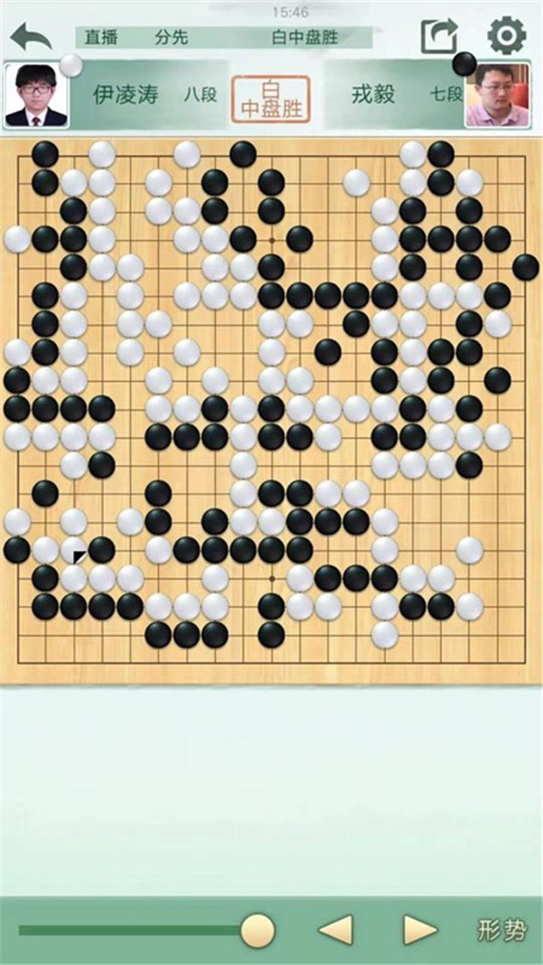 二臺陶欣然執(zhí)白主將對陣世界冠軍江維杰。開局白有利,左邊白棋進(jìn)攻黑棋時候手法過于松緩,局面接近。之后白棋中央又出現(xiàn)緩手黑棋領(lǐng)先。之后右上白棋主動開劫,但是劫材處理失誤,局面惡化。之后黑棋稍有退讓保持小勝。
