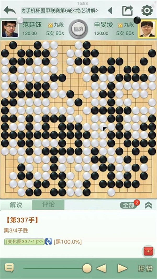 一臺申旻俊執(zhí)黑對陣世界冠軍范廷鈺。開局下邊白棋攻擊手法不當(dāng),黑處理好后局面領(lǐng)先。中盤黑棋在左邊計算精準(zhǔn),下出絕妙手段,在白棋空里出棋后優(yōu)勢擴(kuò)大,之后黑棋穩(wěn)扎穩(wěn)打?qū)?yōu)勢保持至終局獲勝。
