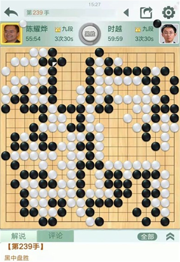 時(shí)越快棋執(zhí)黑對陣世界冠軍陳耀燁。中盤黑棋在右邊白勢中試應(yīng)手,白棋應(yīng)對松緩,被黑棋先手便宜十幾目棋,黑局面領(lǐng)先。之后黑棋行棋嚴(yán)謹(jǐn),中盤獲勝。