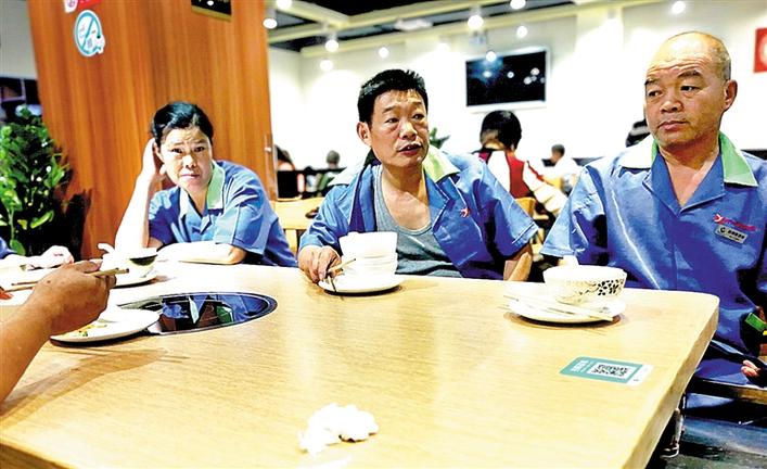 在店里吃飯的人群里,有一張臺(tái)全是清一色的藍(lán)色工作服,特別顯眼?!拔覀兠刻於紩?huì)來這里吃早餐,差不多有一年時(shí)間了,這里的老板太好了,希望他能一直開下去?!边@幾個(gè)大叔、大嬸是周邊物業(yè)的清潔工人,他們每天早上5點(diǎn)鐘就上崗工作,忙完就到了6-7點(diǎn),又餓又累,有一碗熱騰騰的早餐是一件非常幸福的事,而這種開心快樂的事情在這里發(fā)生了。吳姓清潔工說,這里的老板和員工很好,大家來這里吃粥,沒有感到半點(diǎn)不自在,就像在自己家一樣。