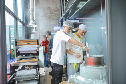 一般的越南河粉店用的是進(jìn)口貨,就算來源再好,在運(yùn)輸過程中總有味道和韌度的流失。傳統(tǒng)河粉機(jī)屬于大型設(shè)備,蔡瀾團(tuán)隊(duì)經(jīng)過22個(gè)月的研發(fā)和改良,縮小尺寸才能將機(jī)器陳列于餐廳,讓顧客見證新鮮河粉生產(chǎn)制作的全過程:大米浸泡至軟,石磨磨成米漿再蒸熟、切割成河粉,用心打造出一碗新鮮美味的Pho。