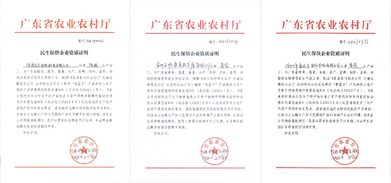 見(jiàn)圳客戶(hù)端·深圳新聞網(wǎng)2020年2月13日訊 農(nóng)產(chǎn)品是群眾生活必需品,農(nóng)業(yè)生產(chǎn)資料是農(nóng)業(yè)生產(chǎn)的必需物資。2020年2月11日-12日,康達(dá)爾集團(tuán)農(nóng)業(yè)板塊三大公司廣東康達(dá)爾農(nóng)牧科技有限公司、惠州正順康畜牧發(fā)展有限公司、深圳市康達(dá)爾都市農(nóng)場(chǎng)有限公司先后獲批“民生保供企業(yè)”資質(zhì)證明,這將非常有利于各企業(yè)開(kāi)展農(nóng)產(chǎn)品和農(nóng)業(yè)生產(chǎn)資料的保供工作,也意味著康達(dá)爾集團(tuán)在這場(chǎng)防疫保供攻堅(jiān)戰(zhàn)中所發(fā)揮的作用獲得了高度的肯定。