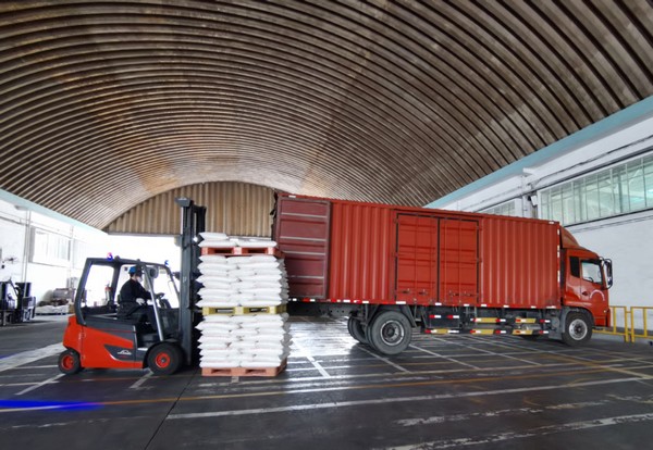 南海糧食員工將向武漢捐贈(zèng)的面包專(zhuān)用粉裝車(chē)