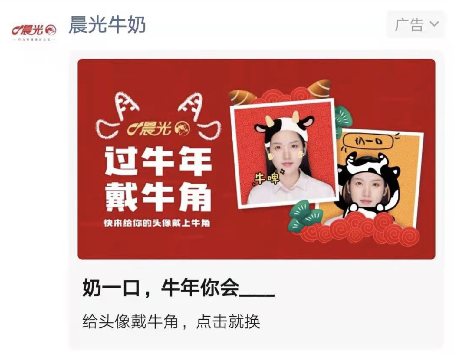 春節(jié),正是各大品牌爭相出招時(shí)刻,如何在一眾營銷活動(dòng)中突出重圍吸引用戶關(guān)注?洞察到用戶在春節(jié)期間“換個(gè)喜慶頭像”以及“發(fā)紅包”的強(qiáng)需求,晨光乳業(yè)趣味游戲H5“換個(gè)頭像犟牛年”和“定制紅包”于除夕前上線,邀請用戶為現(xiàn)有微信頭像戴上“牛角”。牛角頭像不僅可以用于微信,也可用于其他社交平臺。