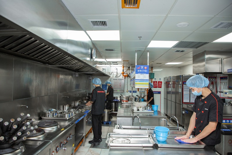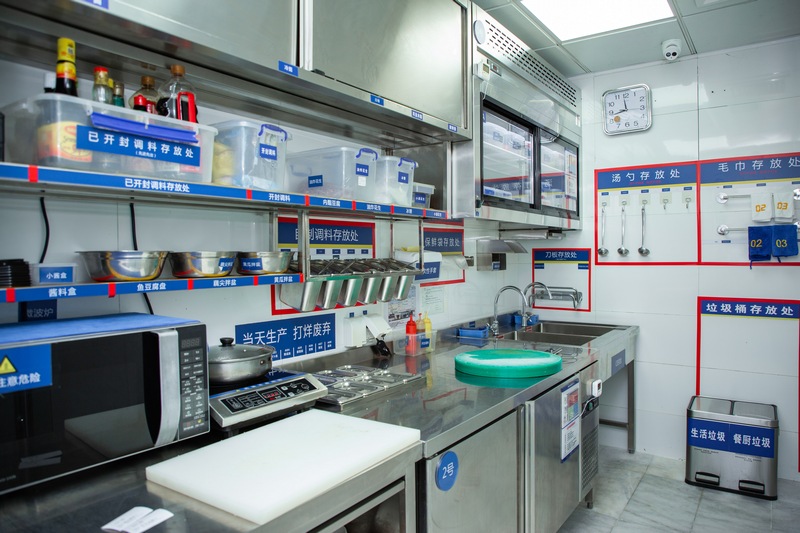 “右手邊是冷菜間,因為食安要求更高,我們都有專門的‘二次更衣室’,在這里更換衣服后,再進入對涼菜進行處理?!必撠?zé)人表示,在專門的涼菜區(qū)里,則可以看到櫥窗中整齊地貼上了諸如“A1圣女果”“B04魚豆腐”之類的標簽,同時備注“當(dāng)天生產(chǎn)打烊廢棄”和“加工日期與廢棄日期”等具體操作指示?!懊客泶蜢群螅覀円矔米贤饩€燈對冷菜間進行半個小時的消毒。”負責(zé)人補充。