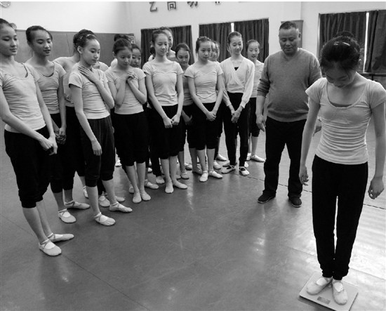 班長杜婉琳說,其實稱體重是舞蹈系的慣例,不僅開學會稱,每個月,甚至每周老師都會抽查體重?!扒啻浩诘呐⑹侨菀着?,一般讓她們多吃魚,營養(yǎng)能保證,也不容易胖?!弊蛱熵撠熒险n的王老師說。