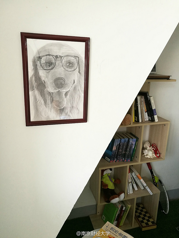 墻上一幅戴著眼鏡的小狗素描圖格外引人注目,它是由602舍長(zhǎng)涂貴平親手畫(huà)的。“這幅畫(huà)還是去年自己參加了一個(gè)帶有公益性質(zhì)的畫(huà)畫(huà)班學(xué)的,我也沒(méi)想到能畫(huà)成這樣?!眮?lái)自貴州的涂貴平害羞地說(shuō),其實(shí)裝飾寢室的初衷很簡(jiǎn)單,錢(qián)就花了300塊不到,主要是希望大學(xué)四年能住在干凈的環(huán)境。