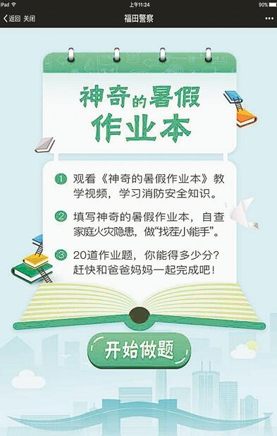 據(jù)介紹,完成這個作業(yè)并不難,只需分三步,第一步是關(guān)注微信公眾號“福田警察”觀看視頻,第二步是掃描二維碼直達(dá)《神奇的暑假作業(yè)本》,第三步是在家長陪同下認(rèn)真完成家庭火災(zāi)隱患排查。當(dāng)然,最重要的是填寫信息欄,將火災(zāi)隱患反饋到后臺?!白鳂I(yè)本”打開后,各種常見的消防隱患會一一展現(xiàn)在眼前。說是作業(yè),它其實(shí)更像一個假期實(shí)踐,通過生動的視頻和有針對性的問答,取代過去紙質(zhì)版消防安全宣傳冊的作用。