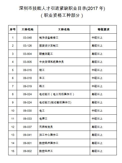 ②職業(yè)資格證書的工種符合《深圳市技能人才引進(jìn)緊缺職業(yè)目錄(2017)》。(見下表)
