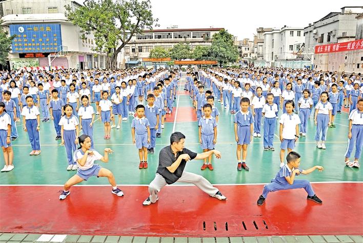 當(dāng)天,利用課間陽(yáng)光體育的時(shí)間,蠔業(yè)小學(xué)1000余名學(xué)生在校內(nèi)饒有興趣地接受了華林派武術(shù)操的教學(xué),華林螳螂拳代表性傳承人冼潤(rùn)長(zhǎng)師傅詳細(xì)地講解了武術(shù)操,并實(shí)地示范。華林派武術(shù)操是“華林螳螂拳”代表性傳承人冼潤(rùn)長(zhǎng)針對(duì)青少年所創(chuàng)編,融入了螳螂拳的武術(shù)元素,深受學(xué)生的歡迎?;顒?dòng)不僅讓孩子深入了解優(yōu)秀傳統(tǒng)文化,還讓孩子“武”起來(lái),益于舒緩學(xué)習(xí)壓力。