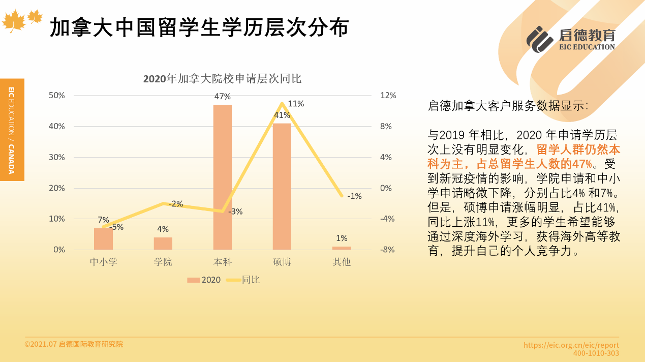 另一組數(shù)據(jù)顯示,2020年中國內(nèi)地學(xué)生新增人數(shù)最多的三個省為安大略?。?9.78% )、英屬哥倫比亞?。?6.17% )、魁北克?。?.49% )。一方面,安大略省與英屬哥倫比亞省這兩個省份的教育資源非常豐富,有多所世界知名大學(xué)讓中國學(xué)生選擇;另一方面,多倫多、溫哥華、渥太華等大城市均在這兩個省份,工作機(jī)會多,移民政策也相對成熟,對希望留在加拿大發(fā)展的留學(xué)生很具吸引力。