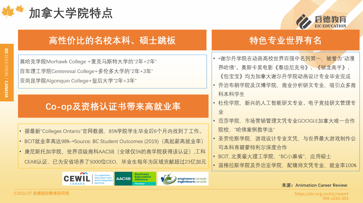 “ Colleges Ontario”官網(wǎng)數(shù)據(jù)顯示,85 %的學(xué)院學(xué)生畢業(yè)后6個月內(nèi)找到了工作,91%的雇主對學(xué)生表示非常滿意。如康尼斯托加學(xué)院,擁有世界頂級商科 AACSB與工科 CEAB認(rèn)證,為安省培養(yǎng)了5000位 CEO,畢業(yè)生每年為區(qū)域貢獻(xiàn)超過23億加元。而奧斯卡獎電影《泰坦尼克號》、《馴龍高手》、《包寶寶》均為加拿大謝爾丹學(xué)院動畫設(shè)計專業(yè)畢業(yè)完成。杜倫學(xué)院的人工智能專業(yè),道格拉斯學(xué)院的配鏡師專業(yè)也是世界有名的特色專業(yè)。