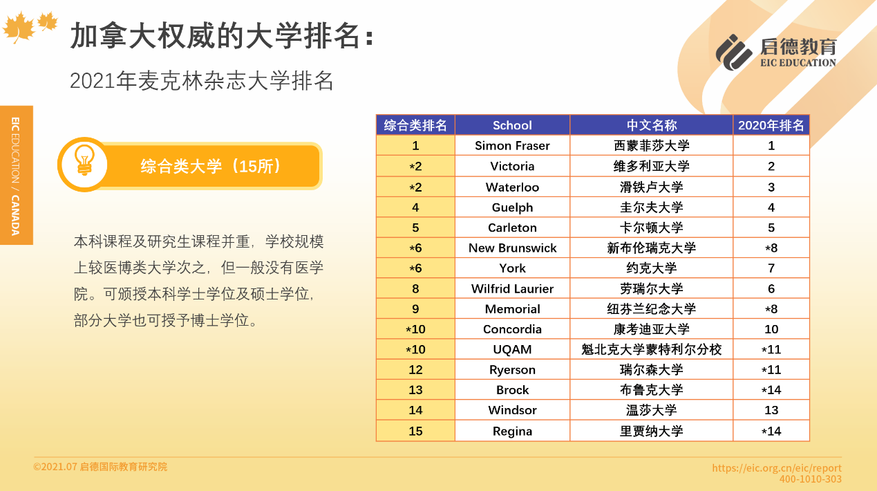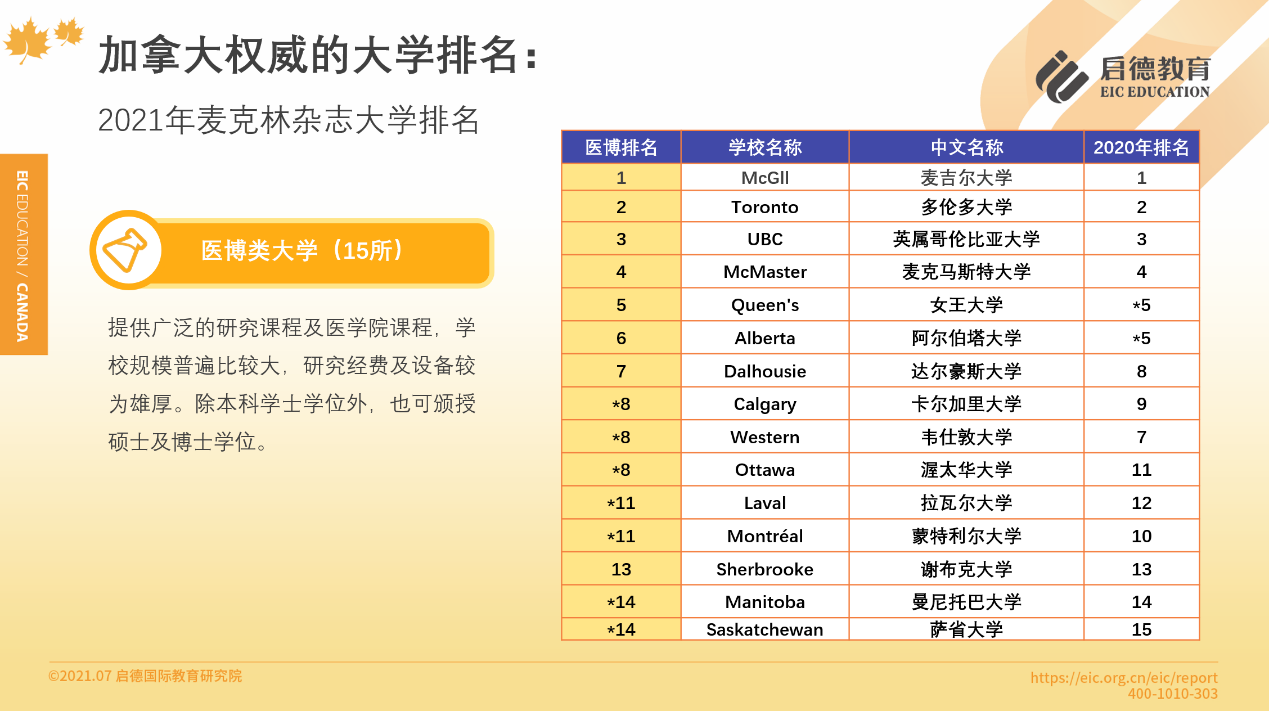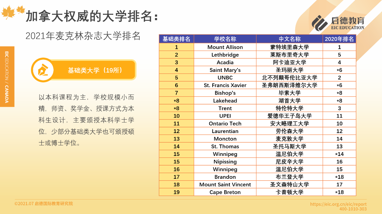 加拿大高校以公立為主,各具特色與優(yōu)勢,教育質(zhì)量在官方評價體系中并沒有顯著區(qū)別,因此,啟德教育建議,在選擇院校時,除了參考麥克林雜志排名,還應(yīng)該通過院校官網(wǎng)或者留學(xué)顧問,更全面地了解加拿大高校的實(shí)力。麥克林排名根據(jù)加拿大大學(xué)的類型,分為醫(yī)博類、綜合類、基礎(chǔ)類三個排名,值得一提的是,連續(xù)21年位于基礎(chǔ)類大學(xué)排名榜首的蒙特艾莉森大學(xué),是加拿大本科畢業(yè)生中獲得羅德獎學(xué)金人數(shù)最多的學(xué)校,羅德獎學(xué)金又被稱為“全球本科生諾貝爾獎”。此外,基礎(chǔ)類排名第19的卡普頓大學(xué),在最近一期的Analytics Insight雜志中,與美國麻省理工學(xué)院、英國華威大學(xué)等一同入選了2021年10家最著名的分析和數(shù)據(jù)科學(xué)機(jī)構(gòu)。