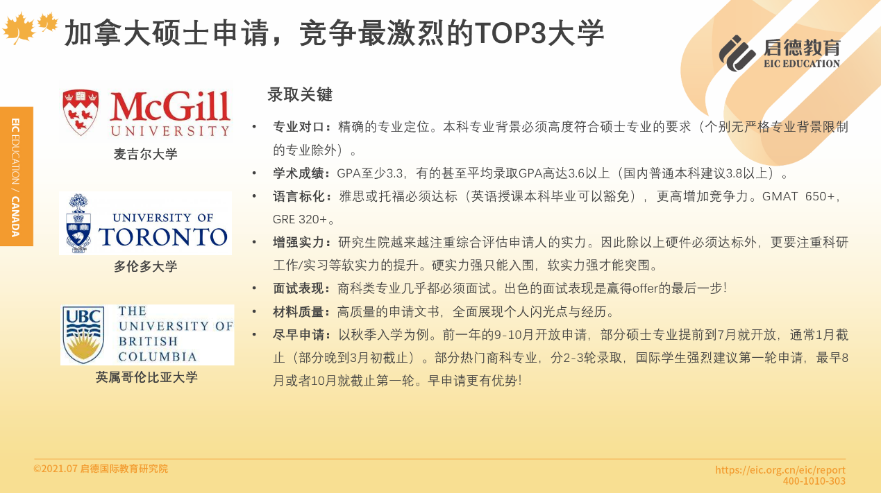 據(jù)啟德留學(xué)加拿大項(xiàng)目介紹,加拿大碩士申請競爭最激烈的三所大學(xué)為麥吉爾大學(xué)、多倫多大學(xué)與英屬哥倫比亞大學(xué)。申請人 GPA至少達(dá)到3.3,有的甚至要求平均錄取 GPA高達(dá)3.6以上(國內(nèi)普通本科建議3.8以上);雅思或托福必須達(dá)標(biāo)(英語授課本科專業(yè)可以豁免), GMAT650+, GRE320+;除硬件必須達(dá)標(biāo)外,加拿大名校注重科研、工作 /實(shí)習(xí)等軟實(shí)力的提升;商科類專業(yè)幾乎都必須面試。