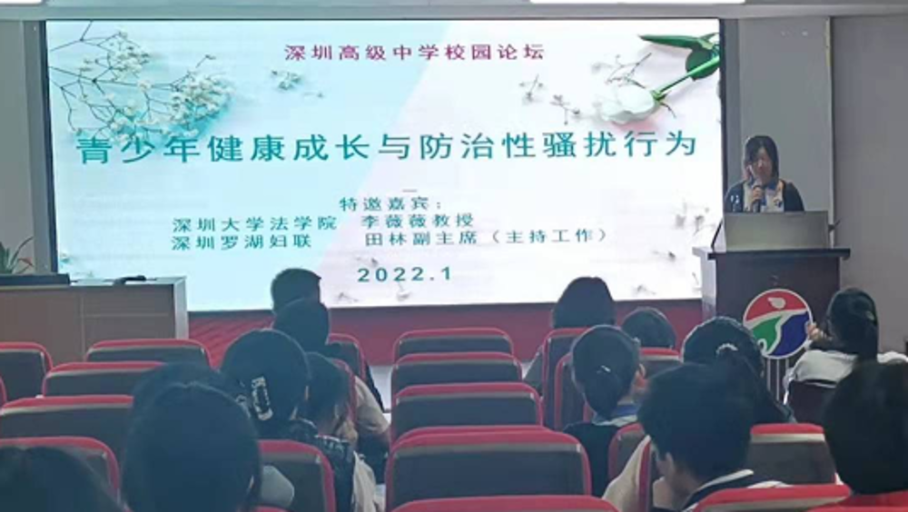 1月8日,深圳市高級(jí)中學(xué)舉辦“青少年健康成長(zhǎng)與防治性騷擾行為”主題論壇,邀請(qǐng)深圳市羅湖區(qū)婦聯(lián)副主席田林、深圳大學(xué)法學(xué)院李薇薇教授、深圳市高級(jí)中學(xué)學(xué)生代表吳雅涵同學(xué)擔(dān)任主講。
