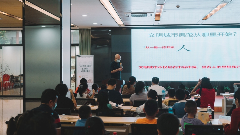 10月31日下午,“‘古詩(shī)詞與修身智慧’社區(qū)居民文明素養(yǎng)提升”活動(dòng)在福光社區(qū)黨群活動(dòng)中心多功能室舉行,活動(dòng)吸引了60余名家長(zhǎng)及小孩參與。