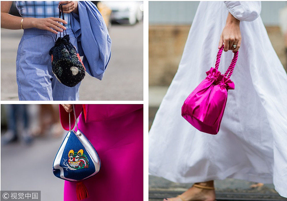 ????現(xiàn)在的時(shí)尚簡直就是上一秒是天堂,下一秒是地獄的Feel。也許之前是個(gè)不起眼的小物件,下一秒就是時(shí)髦單品Top1了,都不敢這么玩的。抽繩口袋,遍布各大超市、菜市場,或者是你家的收納袋,就這樣一個(gè)不起眼的布口袋,就這樣成功“洗白”上位,成為新晉IT Bag。簡簡單單一個(gè)布口袋,拎著就走,真是看多了還覺著很好看啊~(圖片來源:視覺中國)