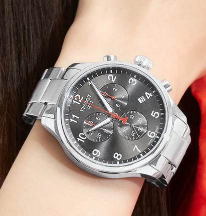 腕表表殼由316L精鋼材質(zhì)打造而成,具備良好的耐腐蝕性和耐久性。表殼正面以拋光打磨處理,側(cè)面則經(jīng)過拉絲處理,呈現(xiàn)出兩種不一樣的觀感。從側(cè)面我們可以感受到這款腕表的曲線線條之美,自然流暢的弧度符合人體美學(xué),佩戴時更加貼合手腕。精鋼表冠采用防滑紋理設(shè)計,以拋光打磨細(xì)節(jié),便于調(diào)校時間。表冠上面鐫刻“T”字樣,簡約又美觀。2點鐘和4點鐘位置設(shè)置計時按鈕,可以啟動、停止計時以及歸零復(fù)位。黑色表盤飾以太陽光紋,帶來迷人的色彩漸變效果。三個計時功能盤井然有序地排列在表盤上,看起來依舊簡潔大方。4點鐘位置設(shè)有日期顯示窗口,增添腕表的實用性。