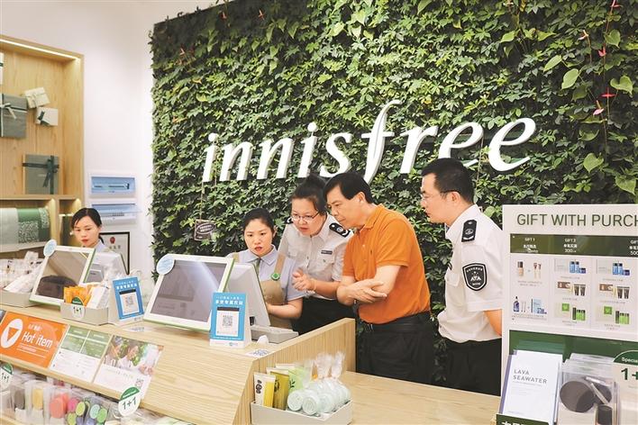 執(zhí)法人員現場對消費者提供的化妝品進行快檢。