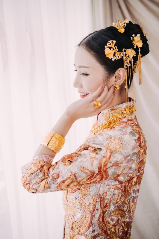良辰吉時,鳴鳳鏘鏘。每一個喜字,每一抹紅色,都將成為這場愛情的最好詮釋。迎親環(huán)節(jié),楊爍夫婦兩人身著中式禮服,金色圖騰配以富貴花朵刺繡,與生生有喜系列并葉銀杏足金項鏈及耳環(huán)相輔相成,搭配新娘清麗的妝容,散發(fā)著中國女性傳統(tǒng)古典的東方美。鳳冠霓裳,纓絡垂旒,配上生生有喜系列足金龍鳳手鐲,經(jīng)典的搭配亦不失傳承的意義,寓意龍鳳呈祥,成雙成對。