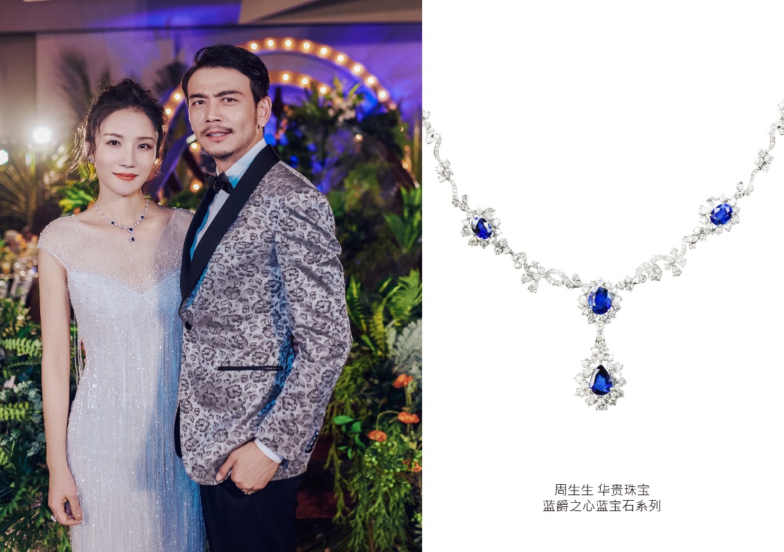 夜幕降臨,璀璨煙花在夜空燃起,為愛綻放。五彩斑斕的煙火下,新娘王黎雯以一身優(yōu)雅長裙搭配周生生華貴珠寶“藍爵之心”藍寶石系列飾品步入晚宴現(xiàn)場,光彩照人而不失典雅氣質(zhì)。深邃奪目的藍寶石項鏈,搭配耳畔間藍寶石耳環(huán),如星光折射到海水上般熠熠生輝。在西方傳統(tǒng)習俗中,婚禮上擁有 S omething blue代表著幸運和忠貞的愛?!八{爵之心”那一抹動人心魄的藍色,傳承西方王室的尊榮,見證楊爍王黎雯夫婦愛之純粹雋永。