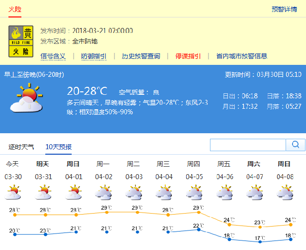 根據(jù)市氣象局發(fā)布消息,本周末到下周初溫暖舒適,無明顯降雨:30日至4月4日多云間晴天,早晚有輕霧,空氣較干燥,30日氣溫20-28℃;5日夜間至6日冷空氣影響,有分散陣雨,北風加大,氣溫下降。近期無明顯降水,需加強防火安全管理。