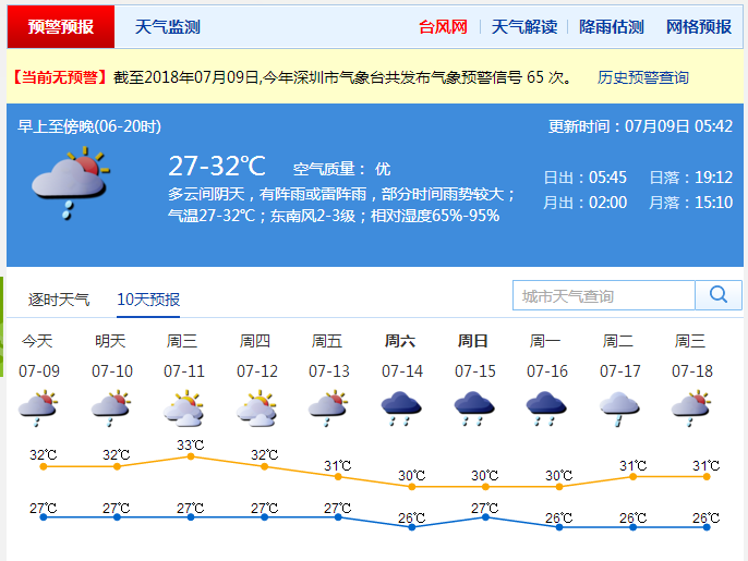 深圳新聞網7月09日訊(記者 何暢)深圳市氣象臺預計,9-10日多云有雷陣雨,部分時間雨勢較大,27-32℃,濕度65%-95%;11-12日天氣酷熱,能見度下降,有灰霾,可能出現(xiàn)局部強對流天氣;13-15日有一次較明顯的降水過程。