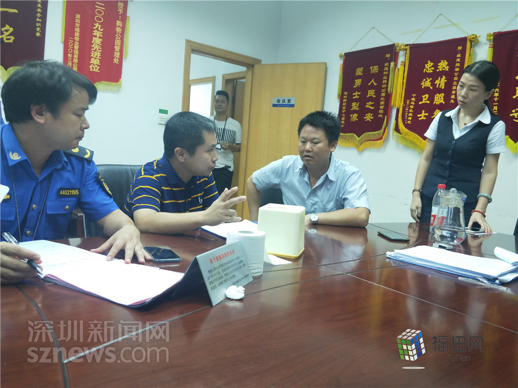 福田區(qū)城管局人員給購(gòu)物公園北園管理處解釋扣分項(xiàng)。