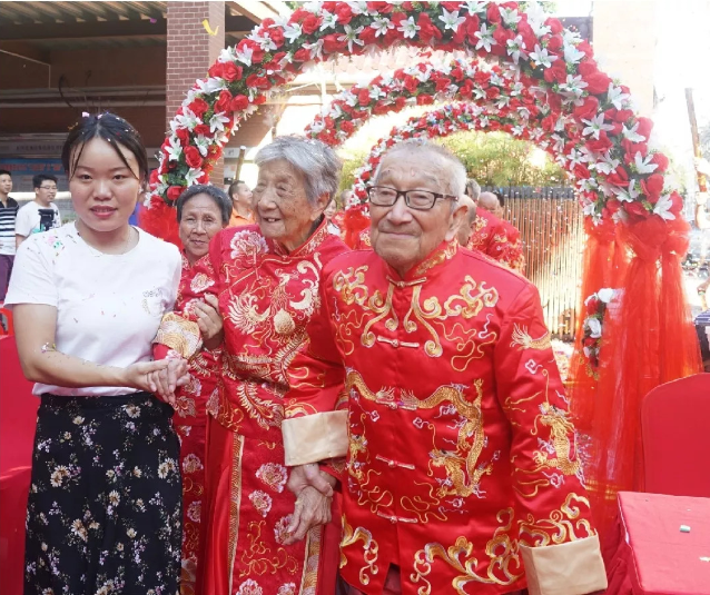 當(dāng)日下午,伴隨著婚禮進行曲響起,金婚老年夫婦身穿中國傳統(tǒng)服飾,緩緩走上紅毯,通過拱形花門,步入慶典會場。他們微微顫抖的手緊緊握在一起,早已爬滿皺紋的臉上笑開了花?,F(xiàn)場頓時洋溢起幸福的味道和甜蜜的氣息。
