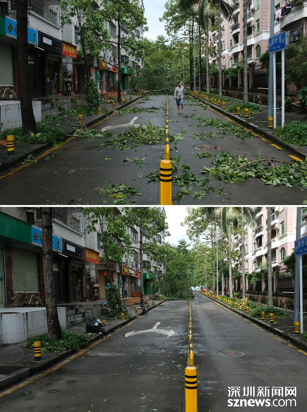 蓮花西地鐵站A出口前后對比圖(上圖:2018年9月17日,臺風(fēng)過后,路面一片狼藉,環(huán)衛(wèi)工人正在清掃。下圖 2018年9月18日下午五點,路面清掃完畢,恢復(fù)整潔)
